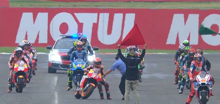 Bukannya segera masuk pit, Marquez memaksakan tetap ingin start normal sampai akhirnya mendapat ride through penalty.