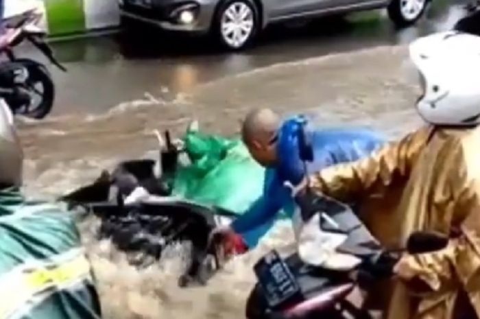 GridMotor - Biker atau pemotor di Malang mencoba melawan arus derasnya banjir kemarin.