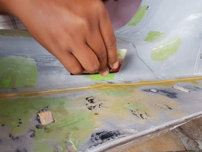 "Kalau untuk menambalnya saya biasanya menggunakan dempul colek," jelasnya sambil menujukan dempul colek merk Wurth miliknya.
