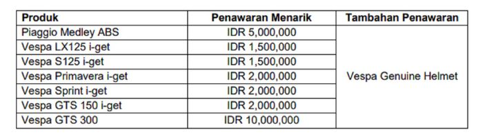 Setiap pembelian unit baru langsung mendapatkan Vespa Genuine Helmet dan penawaran menarik hingga 10 juta rupiah untuk pembelian Vespa dan 5 juta rupiah untuk setiap pembelian unit Piaggio.
