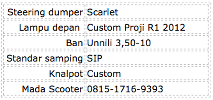 Di kolong body pun terlihat spoiler custom hasil karya Mada Scooter sendiri yang terbuat dari fiber.