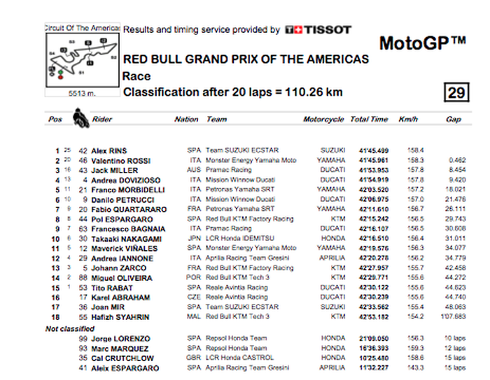 Artikel ini telah tayang di MOTOR Plus-online.com dengan judul Hasil Balap MotoGP Amerika, Rins Buyarkan Kemenangan Valentino Rossi