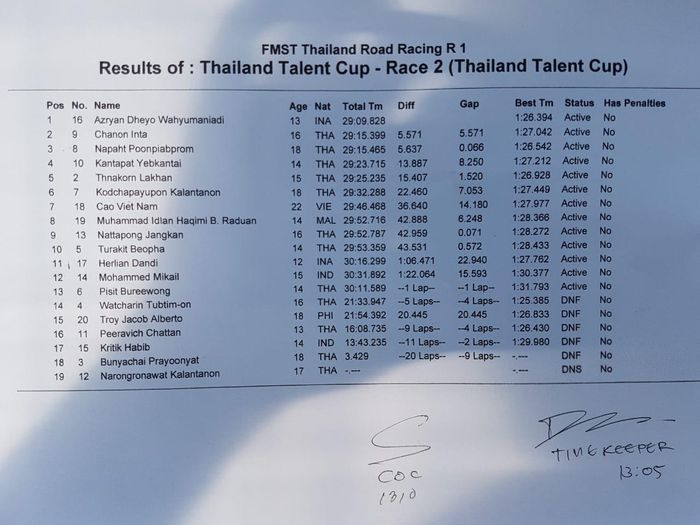 Begitu juga dengan pembalap di posisi ketiga, Napaht Poonpiabprom dengan jarak 5,637 detik.
