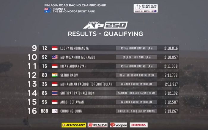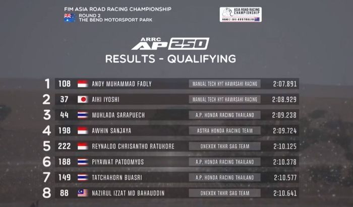 Berikut ini hasil kualifikasi kelas AP250 ARRC Australia 2019: