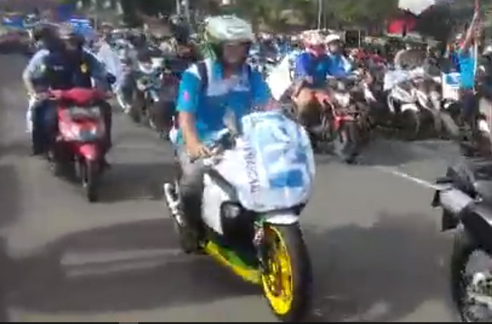 Ketika konvoi, ada seorang buruh yang menyita perhatian warga, karena memblayer atau buka-tutup gas motornya dengan keras.