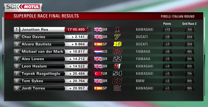 Superpole race WSBK Italia 2019 dimenangkan oleh Jonathan Rea pembalap Kawasaki Racing Team.