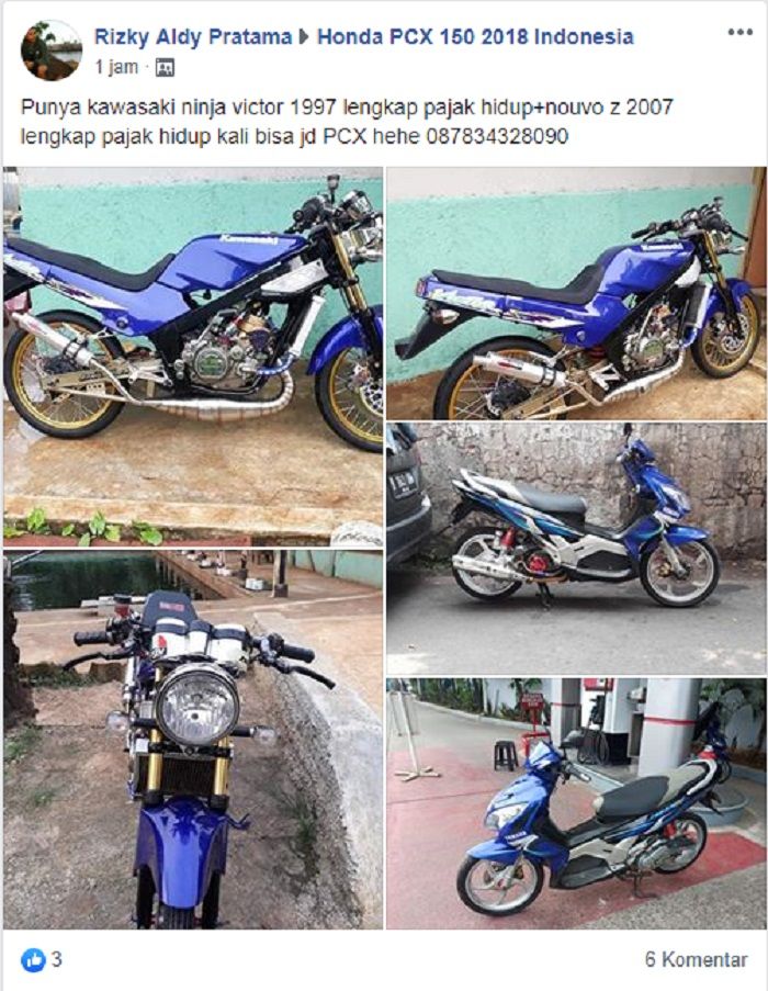 Rizky mencoba peruntungan dengan memposting dua koleksi motornya di grup FB Honda PCX 150 2018 Indonesia.