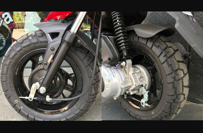 Sesuai dengan konsepnya motor matik adventure, bannya pakai Vee Rubber profil semi pacul.