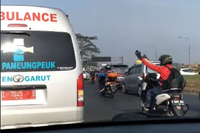 Ada dua bikers yang mengendarai Yamaha NMAX membantu bikin lancar jalan ambulance.