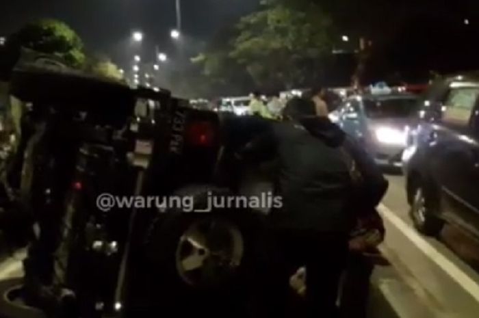 Jeep Rubicon nampak terguling dan melintang di jalanan akibat menabrak separator Busway.