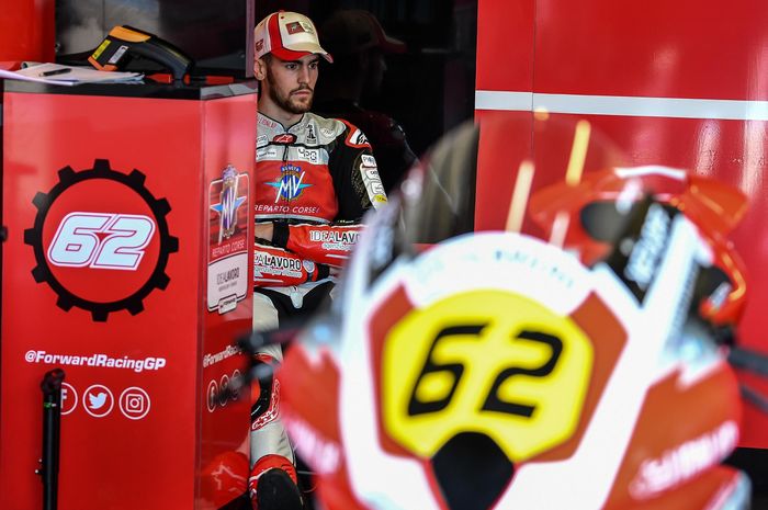 Dimas Ekky Pratama kena senggolan dari pembalap lain, yaitu Stefano Manzi (MV Agusta Idealavoro Forward Racing).