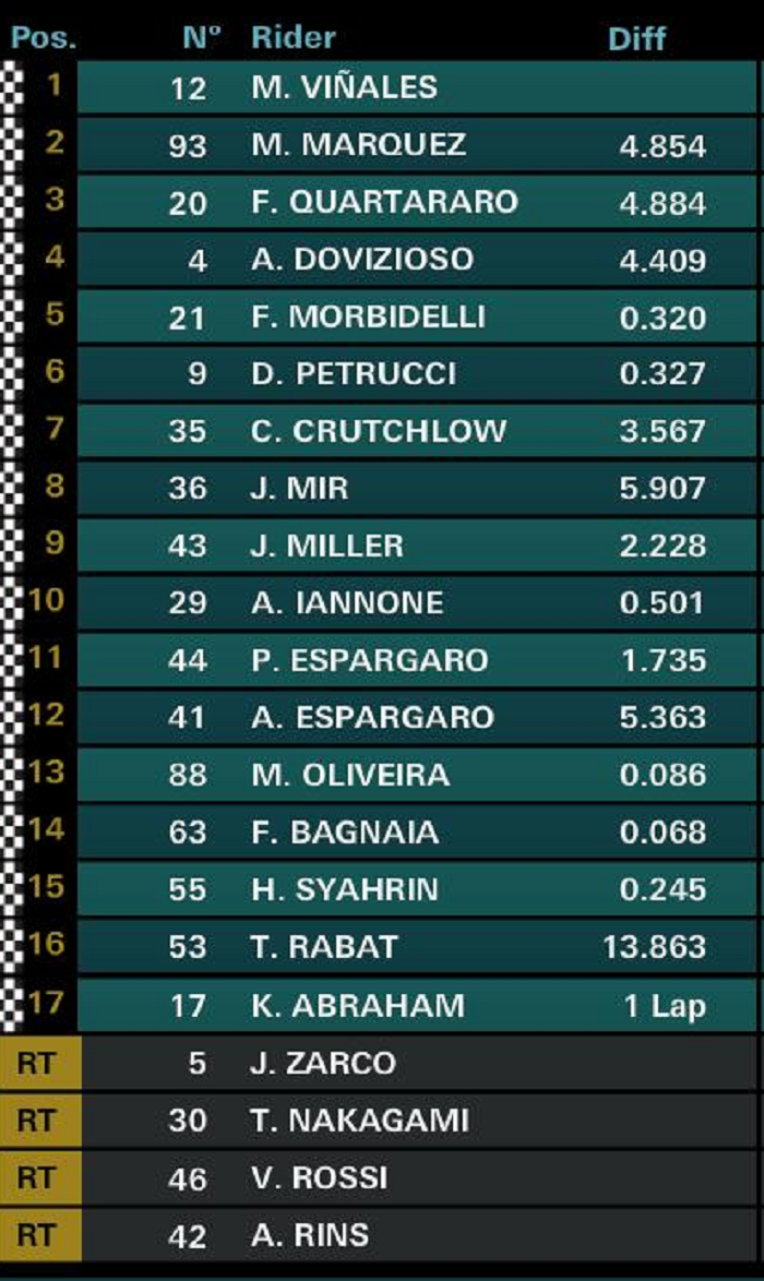 Sedangkan Andrea Dovizioso, meraih posisi ke-4, disusul rekan setim Fabio Quartararo yaitu Franco Morbidelli di posisi ke-5.