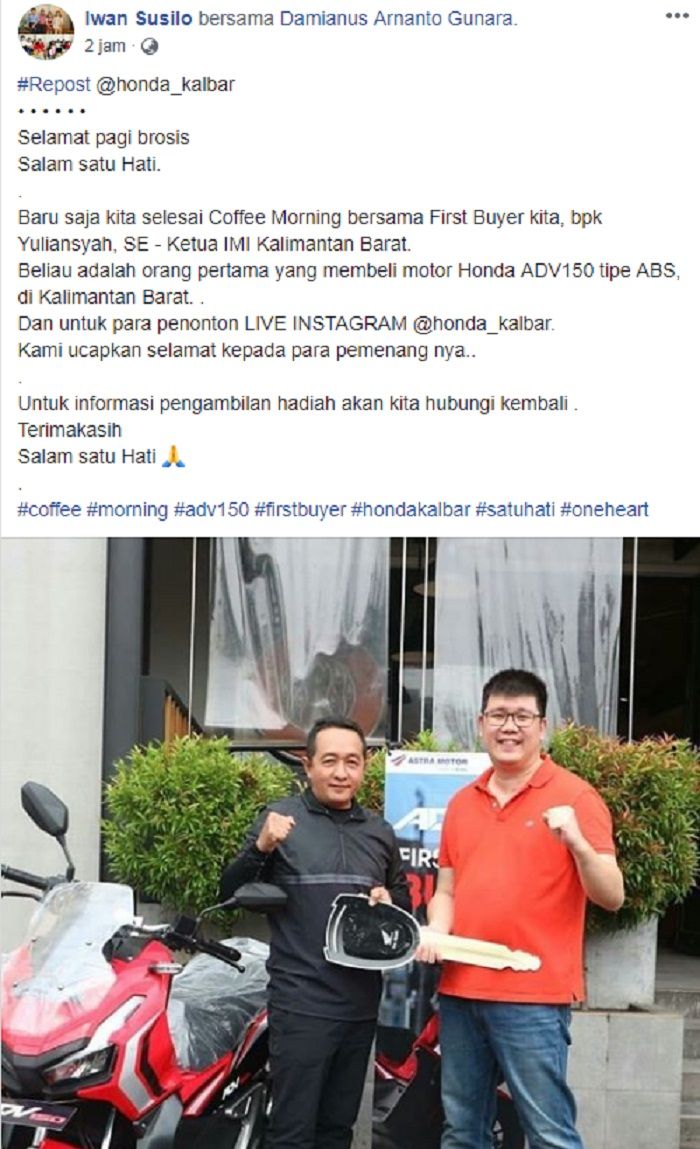Dikutip dari FB Iwan Susilo, Yuliansyah SE jadi pembeli Honda ADV 150 untuk area Kalimantan Barat.