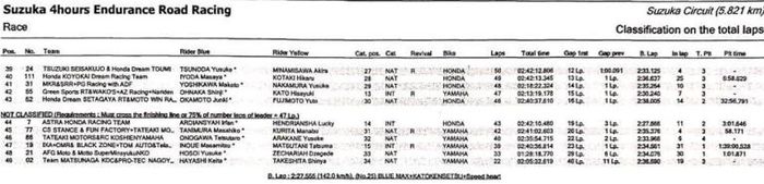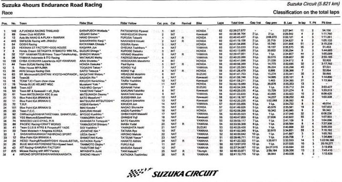 Sementara, pembalap Indonesia yang start terdepan atau pole position di Suzuka 4 Hours Endurance Race, M Faerozi dan Maiku Watanuki (Yamaha Indonesia & Ito Racing) harus puas finis di posisi 9.