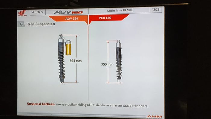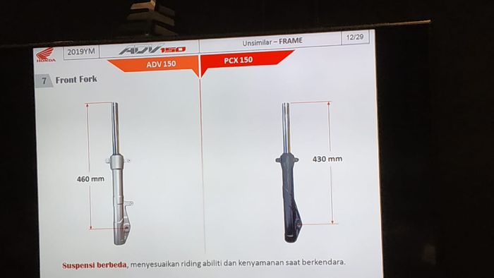 ADV 150 menggunakan sokbreker depan dengan tinggi 460 mm, sedangkan PCX hanya 430 mm.