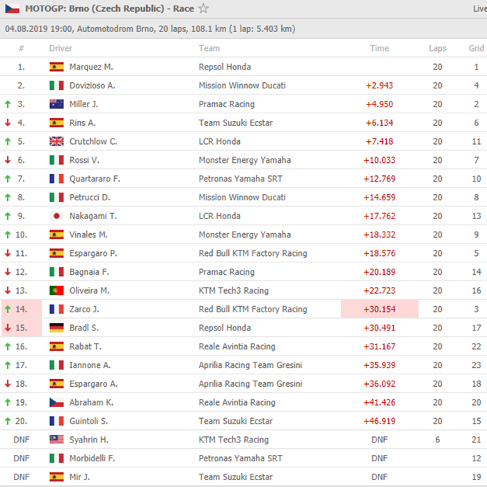 Simak hasil MotoGP Ceko 2019 di bawah :