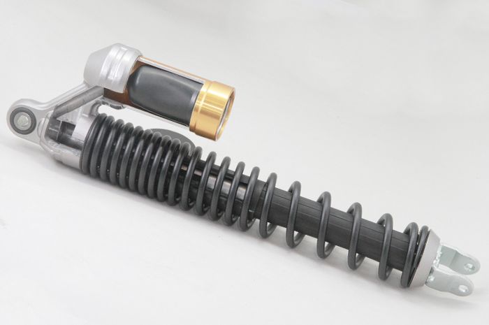 Tinggi sokbreker belakang dari skutik adventure Honda ADV150 adalah 395 mm dan dilengkapi dengan sub-tank (tabung) berkelir emas.