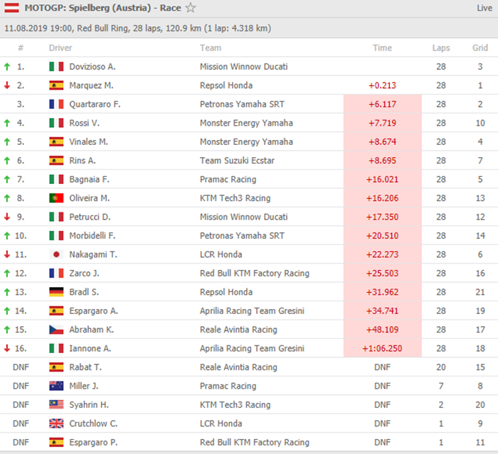 Simak hasil lengkap MotoGP Austria 2019 di bawah :
