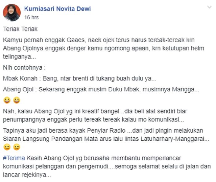 #Terima Kasih Abang Ojol yg berusaha membantu memperlancar komunikasi pelanggan dan pengemudi....semoga selamat selalu di jalan dan lancar rejekinya...," begitu tulis Kurniasari di Facebook.