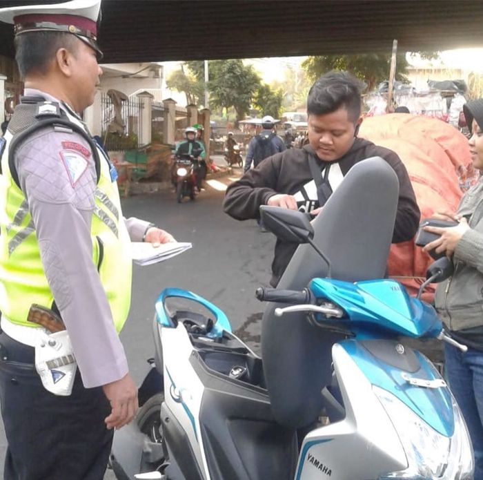Terlihat foto anggota kepolisian yang sedang memeriksa surat-menyurat pemotor yang masuk jalur bus way.