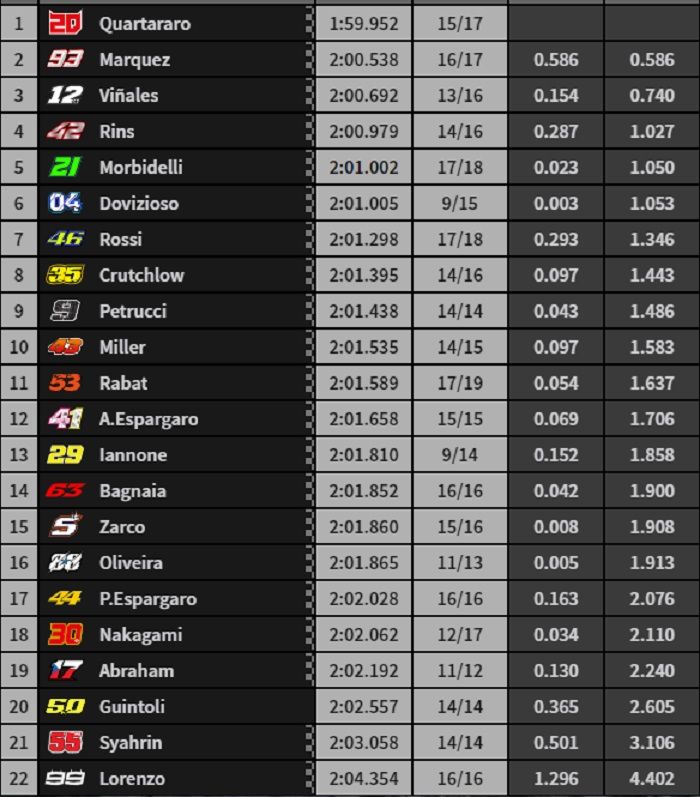 Namun menjelang akhir sesi FP1, Fabio Quartararo berhasil mengalahkan Marc Marquez dan menjadi yang tercepat dengan catatan waktu 1:59.952.