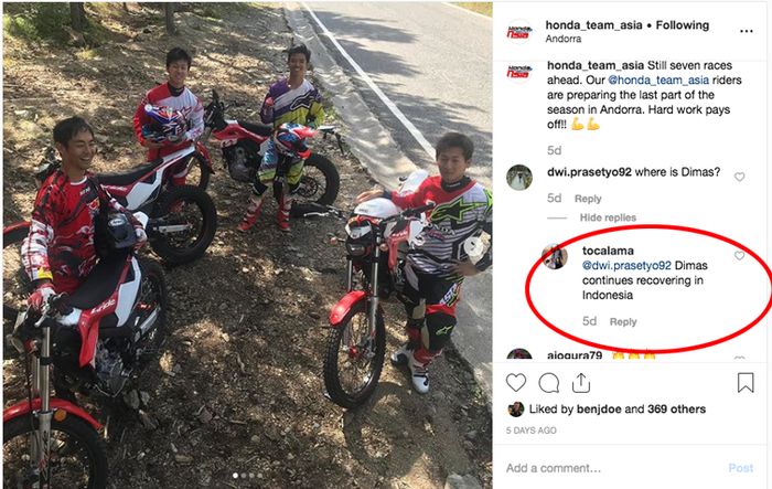 Kalau pun ada jawaban dari @toclama di wall Instagram @honda_team_asia yang mengabarkan Dimas Ekky Pratama masih dalam masa penyembuhan di Indonesia.