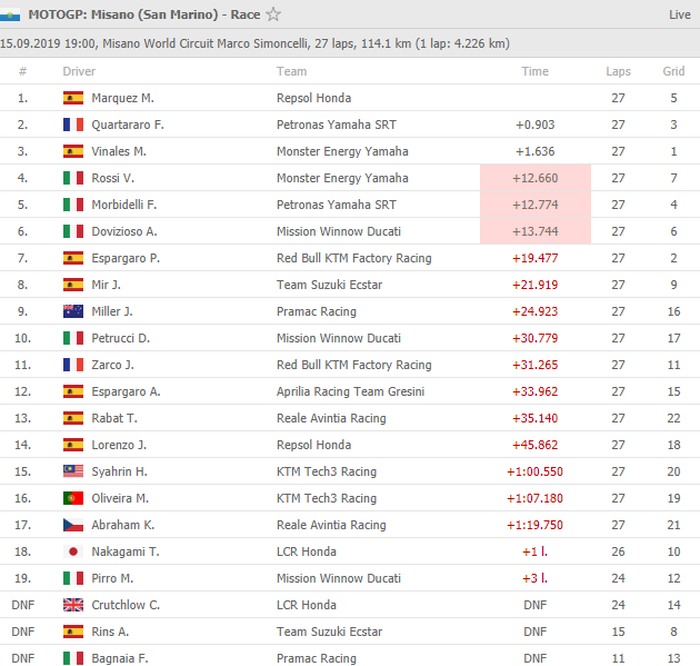 Simak hasil lengkap MotoGP San Marino 2019 di bawah :