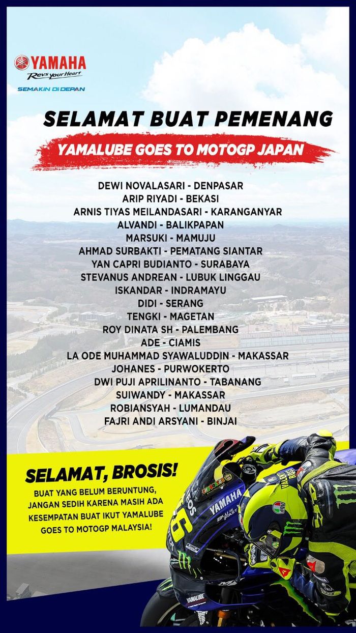 "Terimakasih atas partisipasinya mengikuti program ini. Nikmati keseruan perjalanan ke Jepang dan nonton MotoGP bersama Yamaha,” imbuh Yordan Satriadi.