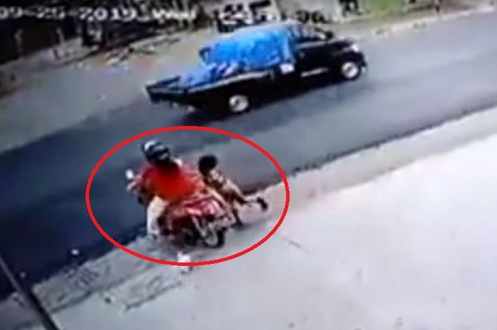 Kejadian berawal saat pemotor tersebut menaikkan anaknya di bagian depan sebelah kanan.