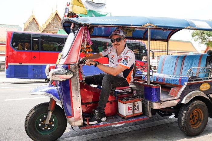 Marquez nampak bersuka cita mengendarai bajaj khas Thailand atau yang dikenal Tuk-tuk.