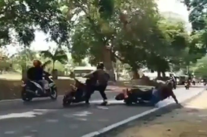 Senggolan enggak terhindarkan dan kedua pemotor tersungkur di aspal.