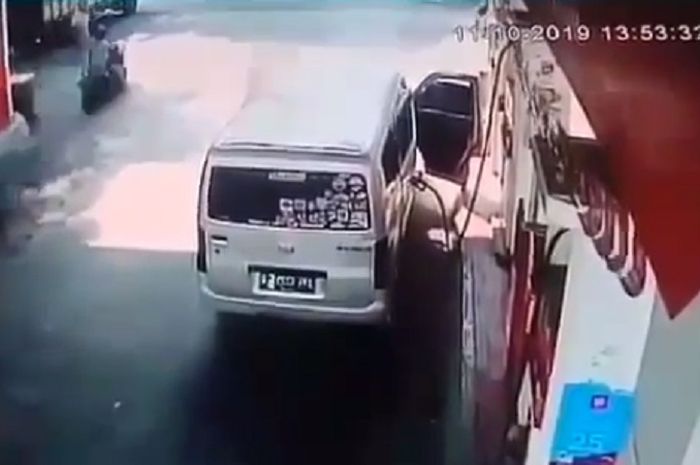 Saat petugas tengah mengisi bensin, tiba-tiba terdengar suara ledakan dari depan mobil.