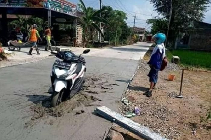 Ujung-ujungnya, jalanan yang baru dicor (diperbaiki) malah rusak terlindas motor.