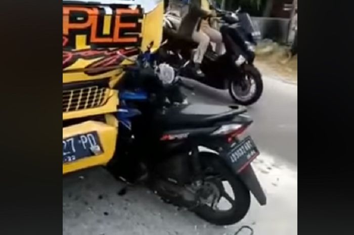 Dari video nampak Honda BeAT tertancap di bagian depan bodi truk warna kuning.