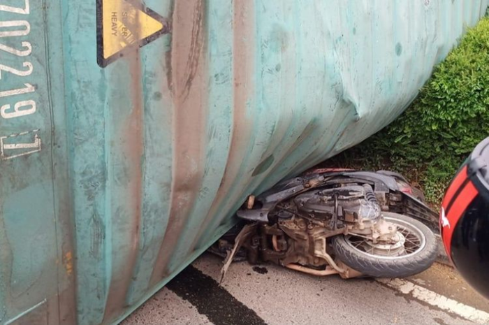 GridMotor.id - Sebuah truk kontainer mengalami kecelakaan dan menimpa sebuah Honda BeAT sampai hancur.