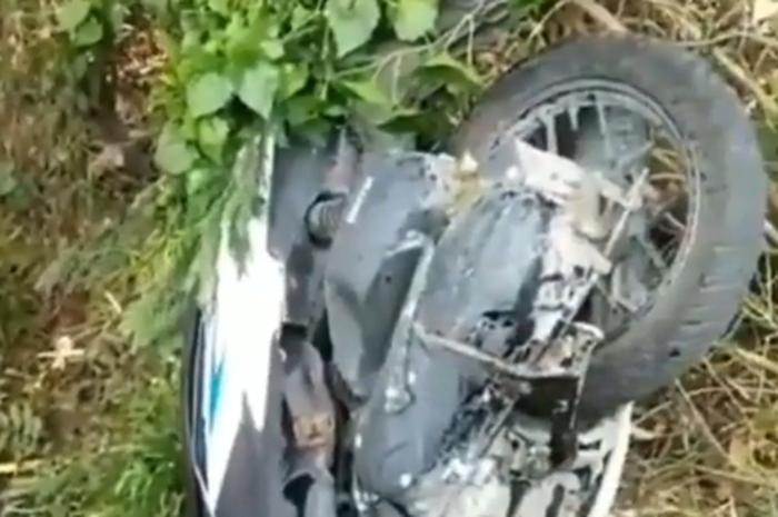 Sementara Honda Vario berkelir putih-biru yang ditungganginya terlihat dalam posisi terbalik di selokan.