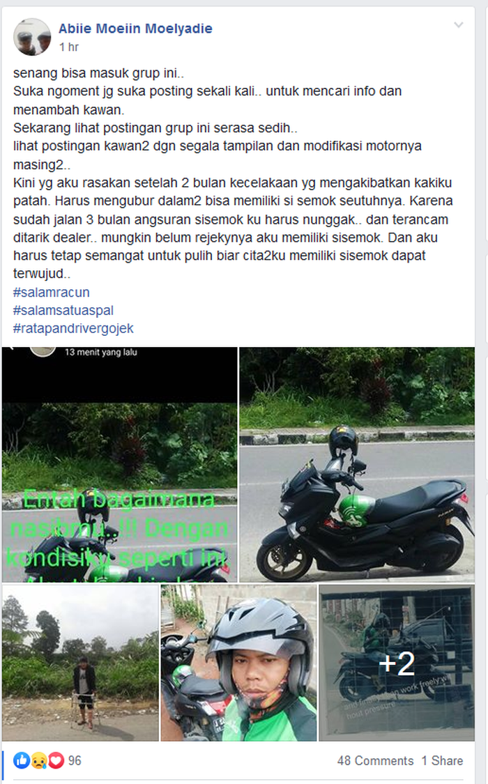 Driver ojol pemilik akun Facebook Abiie Moeiin Moelyadie itu menceritakannya di grup Facebook Komunitas Yamaha NMAX Indonesia.