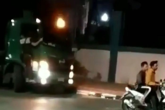 Dengan menggantung di pintu truk sebelah kakan, pemalak berusaha terus mengancam sopir dan meminta sejumlah uang.
