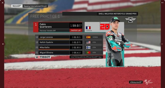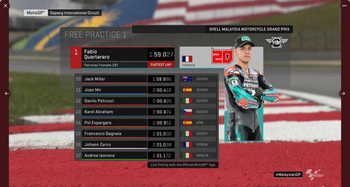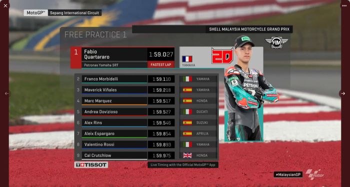 Fabio Quartararo akhirnya berhasil menjadi yang tercepat di FP1 MotoGP Malaysia 2019, dengan raihan waktu 1:59,027.
