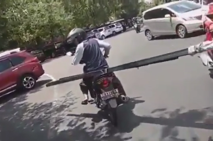 Gridmotor.id - Seorang pemotor Honda Revo terekam kamera sedang membawa muatan palang besi yang lebar banget.