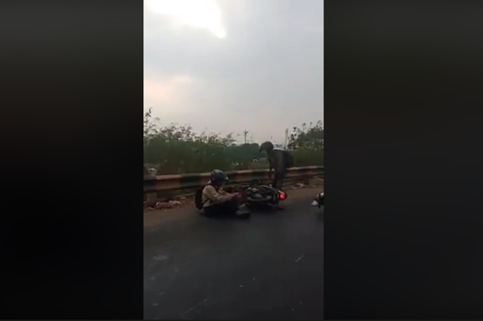 Dikutip MotorPlus-Online.com dari akun Facebook Amin Hadinata, yang mengunggah video pemotor yang bergelimpangan di jalan akibat tumpahan oli di jalan.