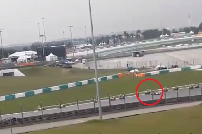 Saat itu, Afridza Syach Munandar terjatuh di tengah sirkuit sementara di belakangnya kontestan lainnya yang melaju kencang.
