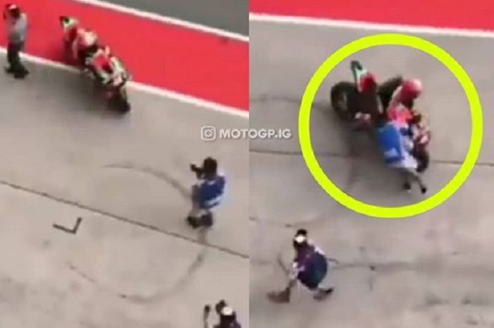 Dalam video yang diunggah oleh akun Instagram @gpmania.id, terlihat seorang jurnalis sedang berjalan di area pit.