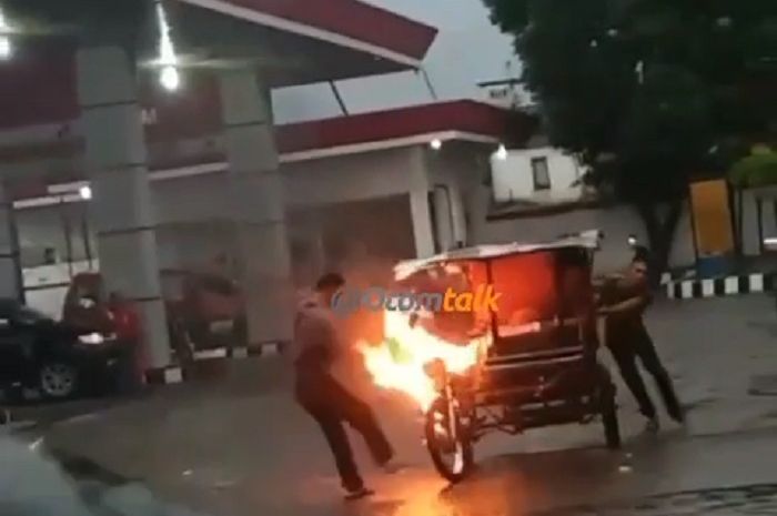 Dikutip dari akun Instagram @otomtalk, sebuah bentor mendadak terbakar hebat di depan pom bensin.