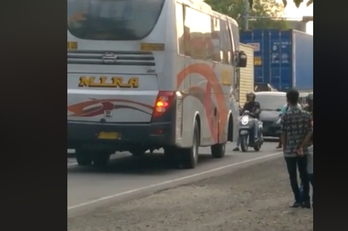 Pada video terlihat pengendara bus dihadang oleh pemotor Honda Scoopy.