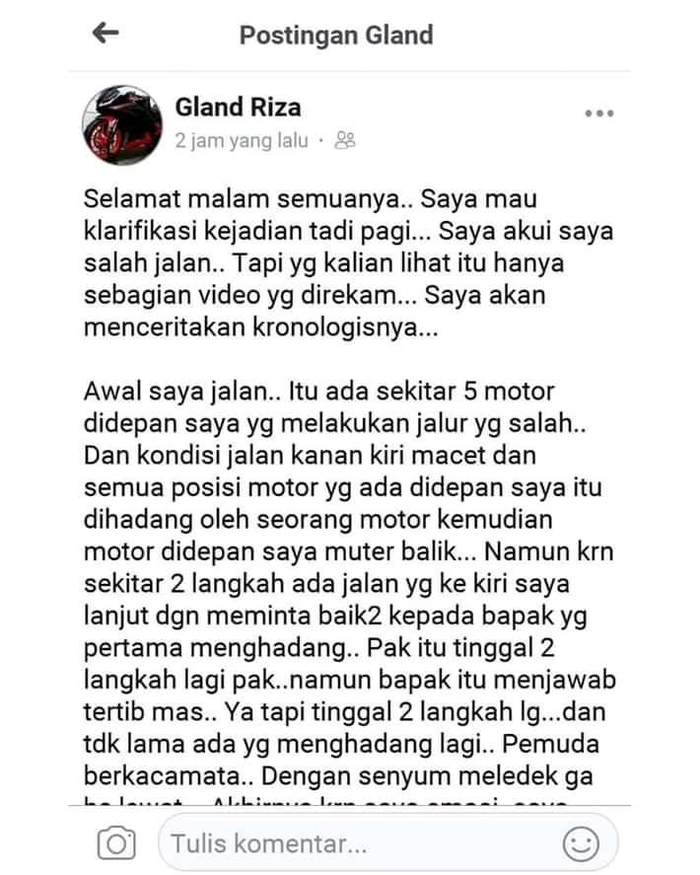 Nah pengendara motor Yamaha R15 yang bernama Gland Riza tersebut pun mengunggah sebuah postingan klarifikasi.