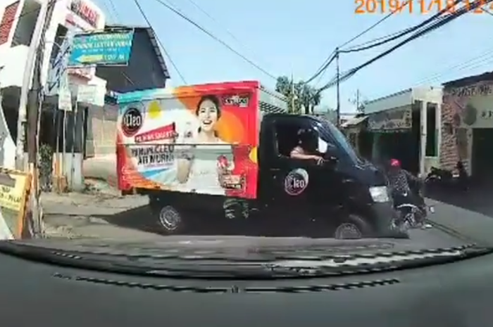 Mobil box Daihatsu Gran Max menabrak pemotor Honda BeAT di sebuah persimpangan.