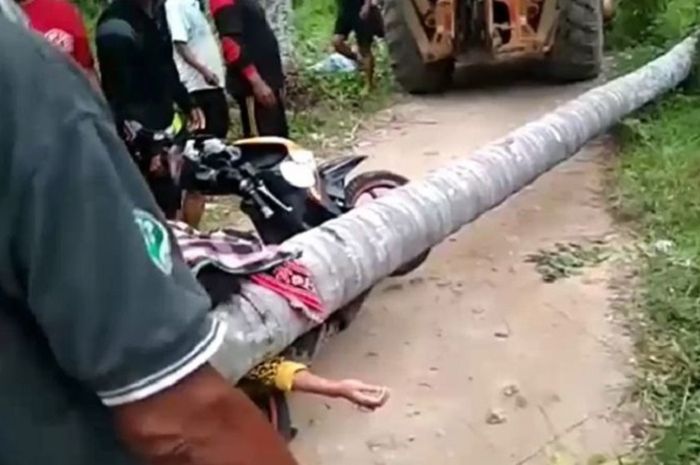 Tragisnya, pemotor itu tewas usai tertimpa pohon kelapa yang tumbang.