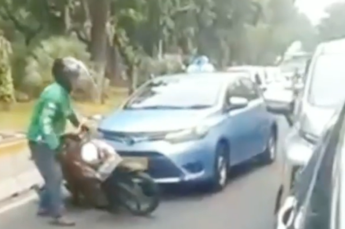 Kemudian saat driver ojol mengangkat motornya, tiba-tiba secara tidak sengaja grip gas terputar dan akhirnya motor menabrak mobil sang perekam video.