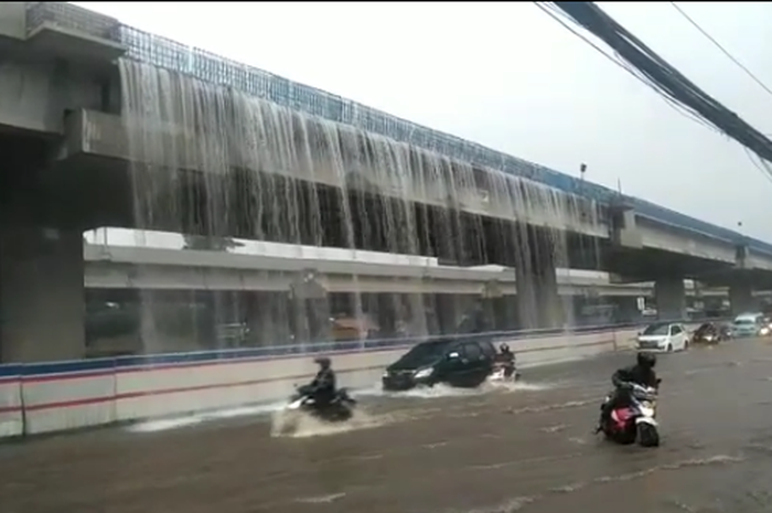Gridmotor.id - Video air terjun dadakan yang muncul dari flyover tol Becakayu bikin banjir jalan raya Kalimalang, Pondok Kelapa, Jakarta Timur saat ini sedang viral di media sosial.